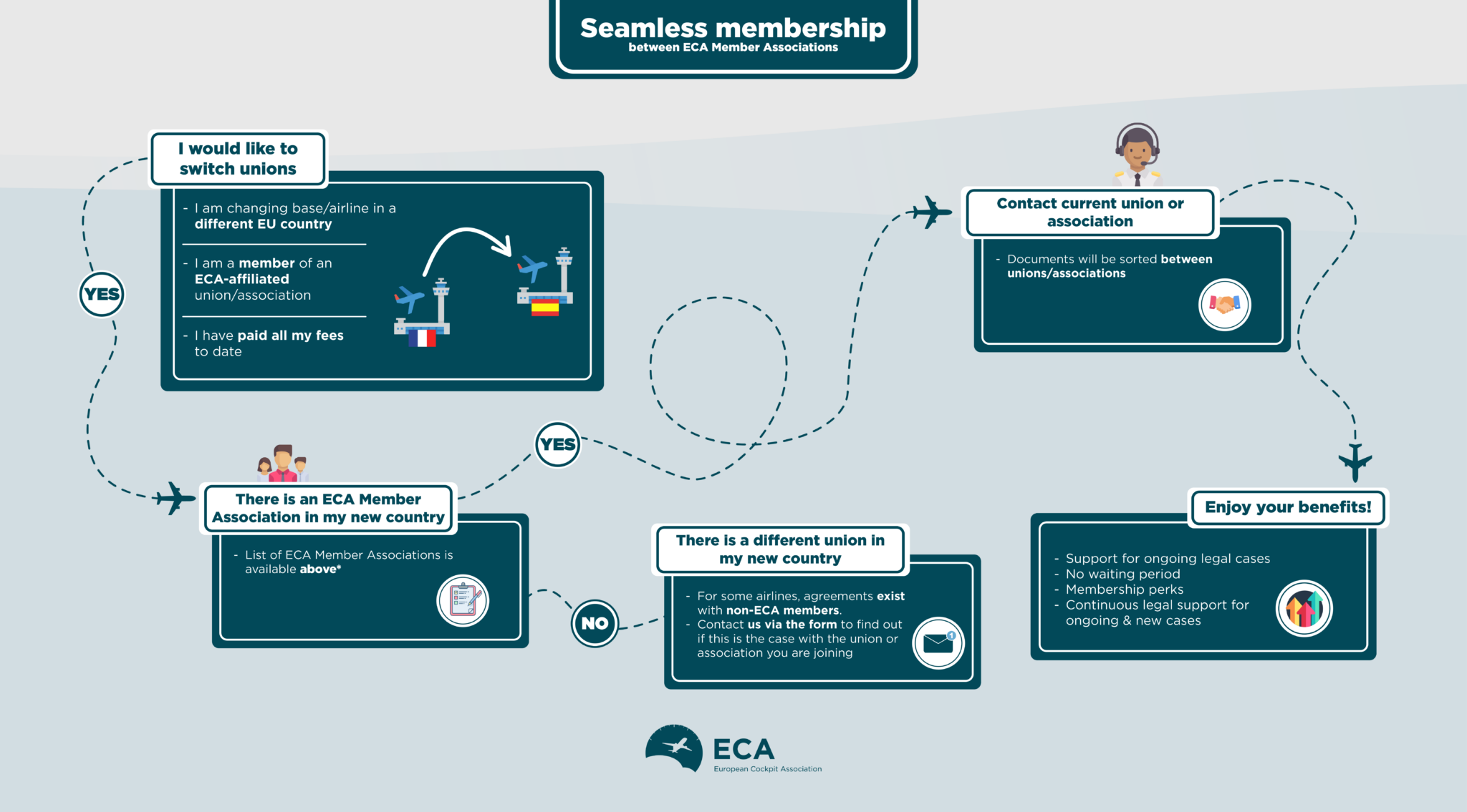 Unions and Pilot Associations that are affiliated to the European Cockpit Association (ECA) have adopted the “seamless membership” scheme which gives pilots the possibility to carry their union membership from their current union to the union in the country of their new base without having to start a new waiting period. This means no waiting time until they can benefit from all union membership services and benefits, including legal support.